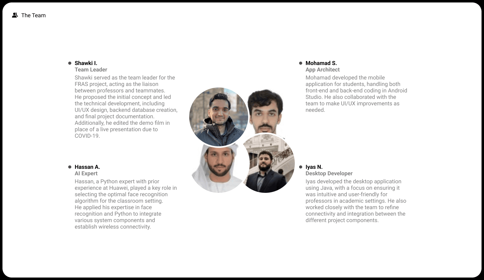 Hassan Al Ali, AI Expert: Specialized in Python and facial recognition algorithms. Selected and implemented the optimal facial detection model, and managed backend integration.