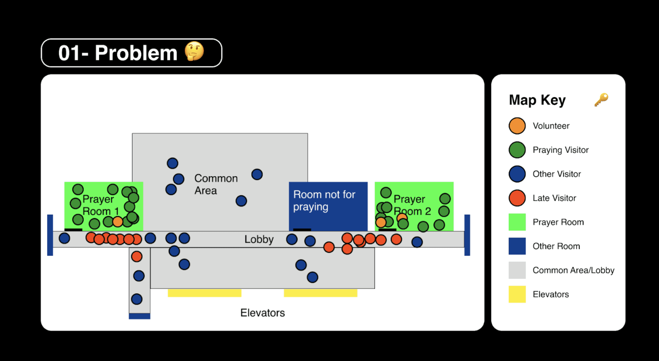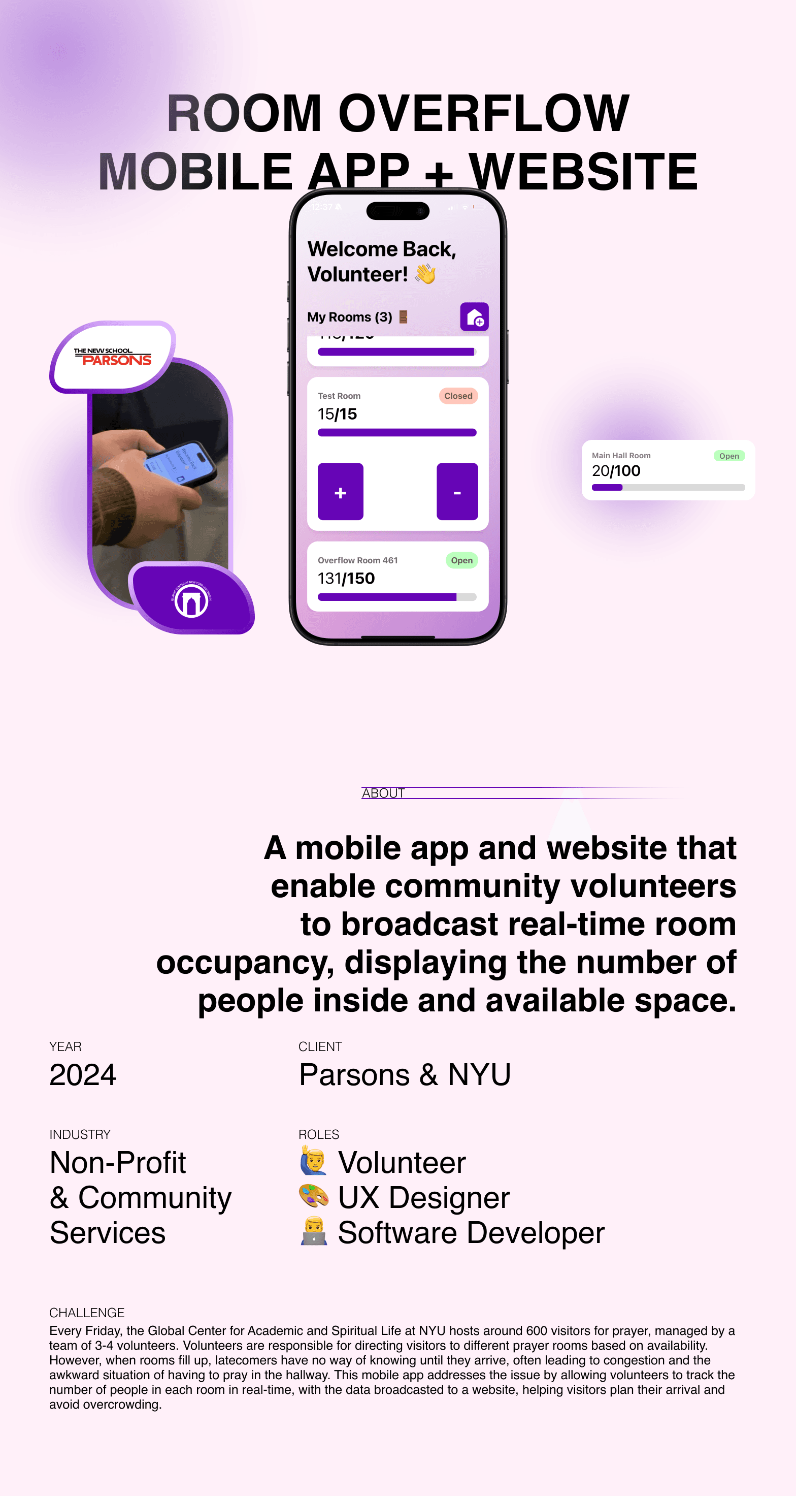 Every Friday, around 600 people gather for prayer at the NYU Global Center for Spiritual and Academic Life. Due to limited space and no live room availability updates, latecomers often end up praying in hallways, leading to congestion. To solve this, I developed a simple real-time room occupancy tracking system, consisting of a mobile app for volunteers and a public website for visitors.