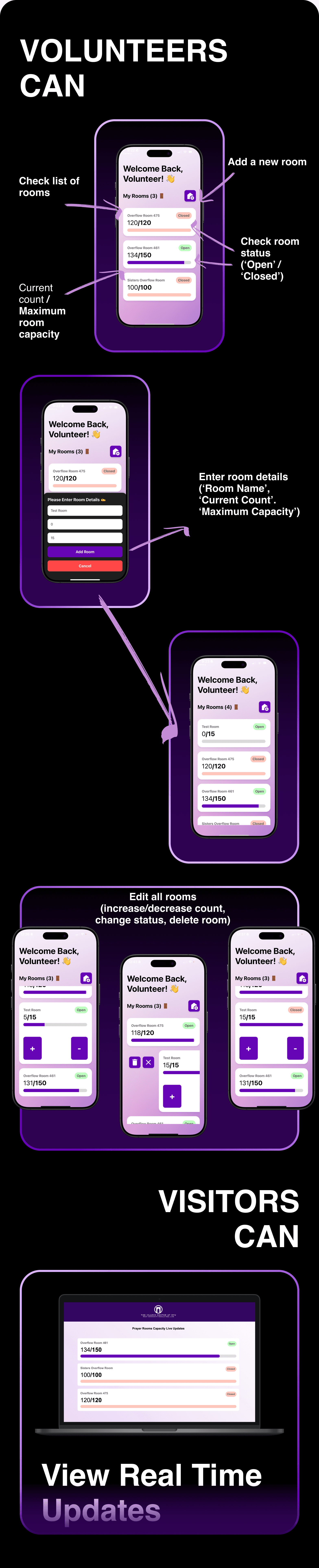 I broke the solution down into two major components to streamline functionality for both volunteers and visitors: a mobile app for updating room counts and a public website for real-time viewing.