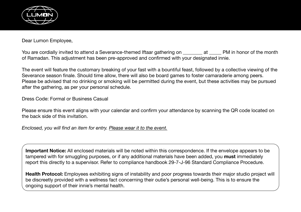 I combined my love for the TV show Severance with the spirit of Ramadan by organizing a themed 'Iftar' (fasting) event for my classmates. The idea was to create an immersive experience that celebrated both the show and the tradition, culminating in a group viewing of the Season 2 finale. To make the event feel special and true to the world of Severance, I designed and produced custom MDR badges for each guest, along with personalized invitations and "outie fact" cards. What started as a fan tribute turned into a unique blend of storytelling, design, and cultural exchange.